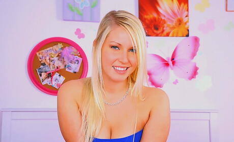 Excellent american young Vanessa Cage in sexy skirt revealing big knockers and bald pussy