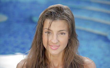 Excellent babe Maria exposes tiny tits and spreads her legs near the pool