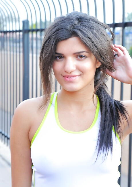 Excellent brunette babe Trisha baring big hooters and spreading her legs outdoor