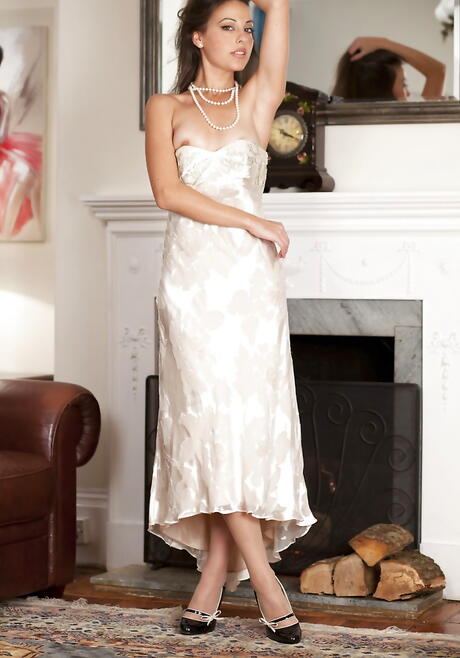 Excellent brunette bombshell Lorena G in fancy skirt unveils small tits and shaved pussy