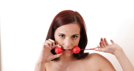 Excellent brunette cutie Lucile exhibits big boobs and puts a toy in her cunt