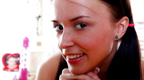 Excellent dark hair teen Zoya in uniform outfit denudes tiny tits and toys her cunt