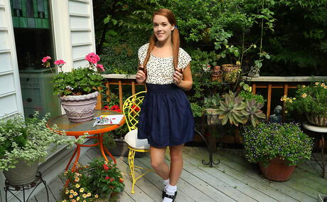 Excellent teen Kymberly Brix exhibits tiny tits and loves dildo outdoor