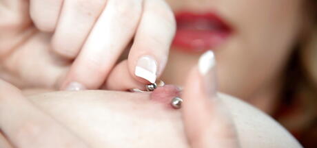 Facinating blonde cutie Rockell in sexy panties exposes big hooters and jerks off outdoor