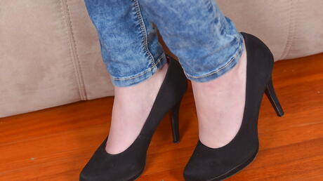Facinating czech hottie Linda Sweet in tight jeans exposing big tits and bald pussy