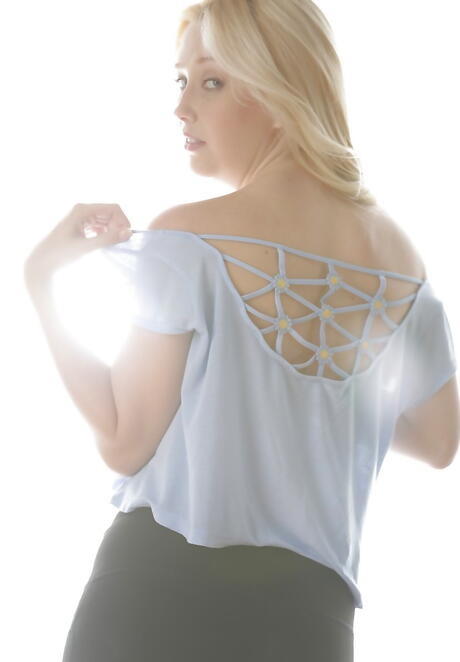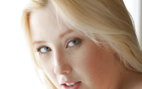Foxy american blond teen Samantha Rone in sexy glasses exhibiting small tits and pussy