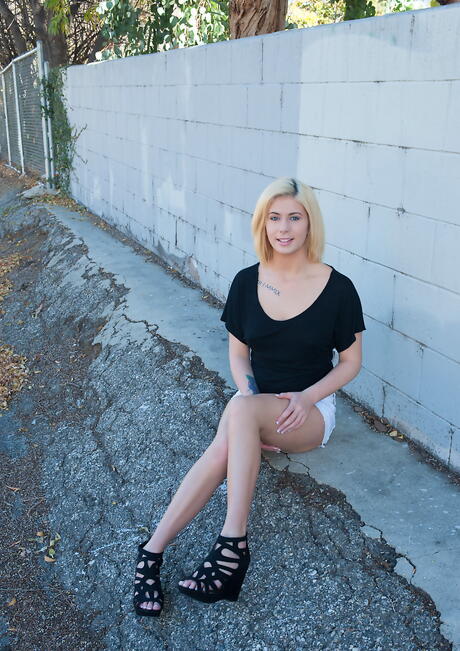 Foxy american blonde hottie Cindy Lou in sexy undies exposes small tits and sissy outside
