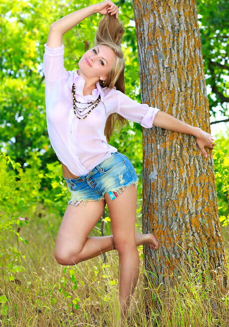 Foxy blond youthful Alessandra A exposing big knockers and undressing outdoor