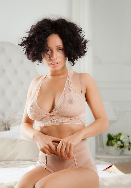 Foxy brunette teen Pammie Lee in underwear showing big tits and hairy pussy
