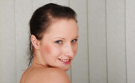 Foxy brunette young Gitti in fancy skirt exhibiting big boobies and spreading her legs