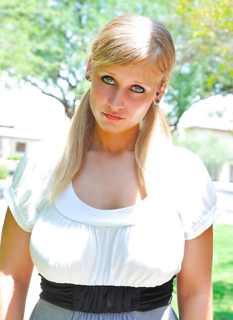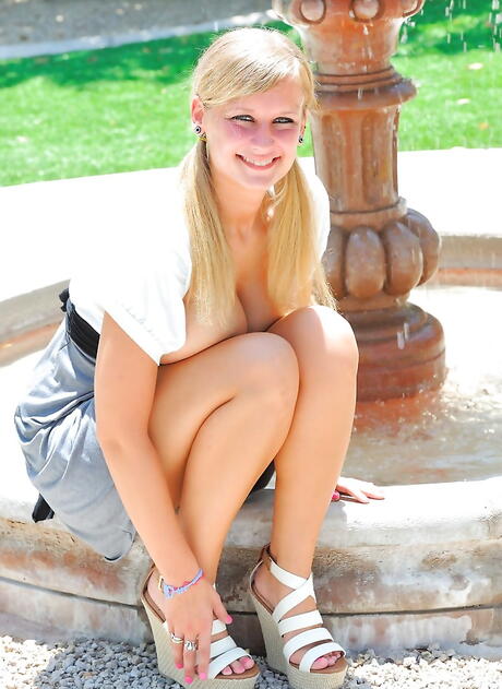 Glamorous american blond Alice Wonder in skirt likes some hot foot fetish outside