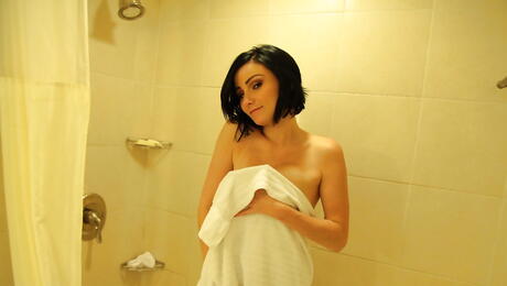 Glamorous american bombshell Veruca James exposes big hooters and nice pussy in the bathroom