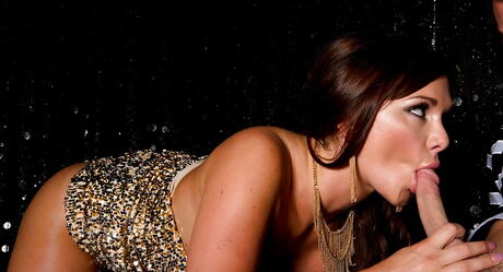 Glamorous american pornstar Destiny Dixon in fancy skirt sucking hot dick and gets a cum shot in mouth