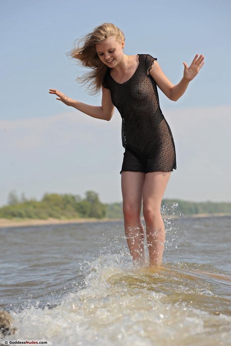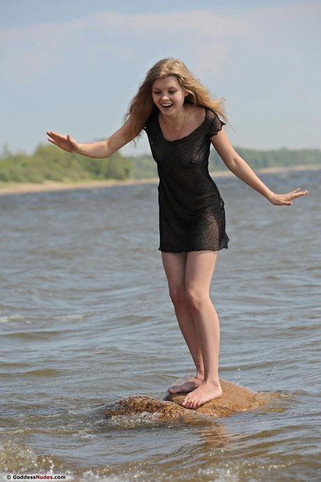 Lean teen Kisa models totally naked on a rocky beach during a solo shoot