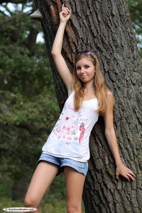 Skinny blonde teen Hellan gets naked on a rocky outcropping during solo action