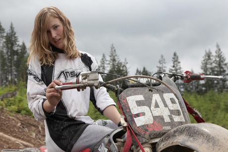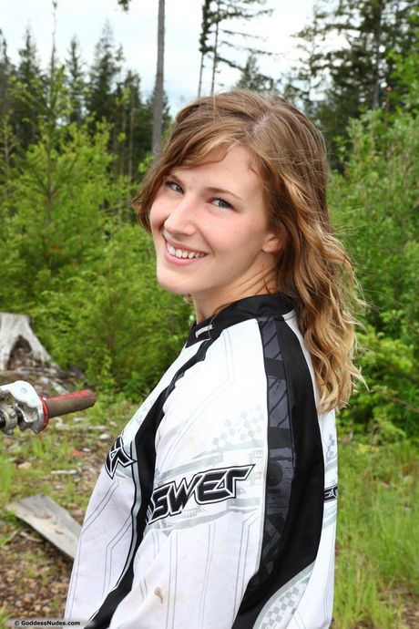 Skinny teen Dawn poses nude on her motorcycle and in the garage