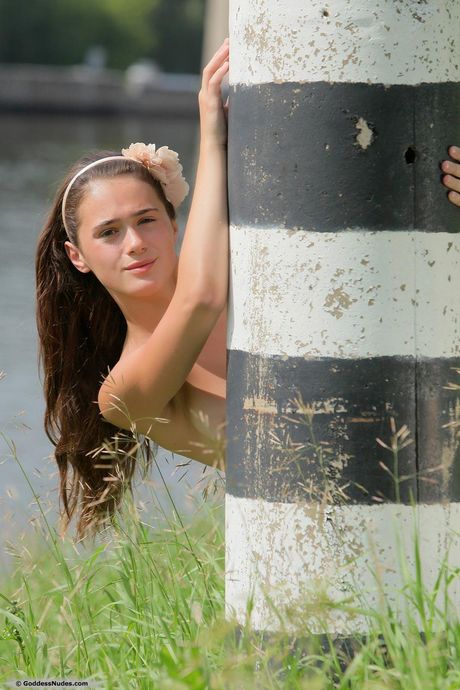 Slender teen Vinona demonstrates her small tits and shaved pussy in the nude