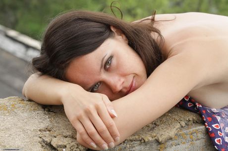 Svelte teen Evgenya shows her tiny tits and shaved pussy in a solo
