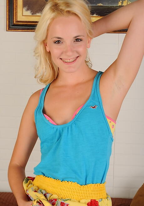Gracile american blond teen Sara James bares tiny tits and spreads her legs