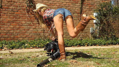 Gracile american blonde young Amy Brooke in shorts baring her butt and shaved pussy outdoor