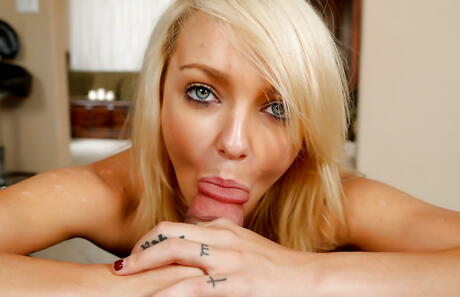 Gracile american blonde youthful Carmen Callaway well sucking big rod and gets a cum blast in her mouth