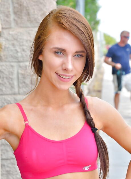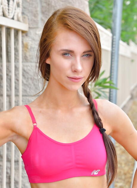Gracile american redhead teen Anya Olsen in sexy shorts exhibiting her butt and playing with dildo in office