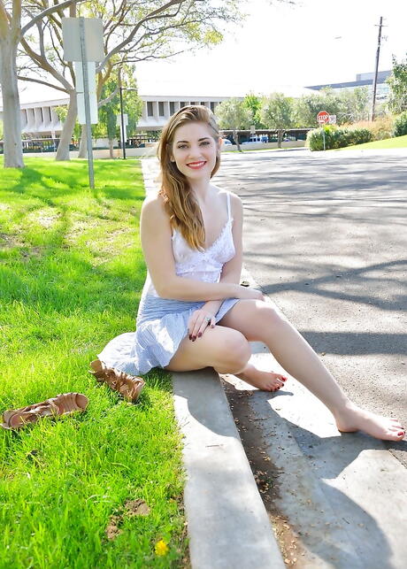 Gracile american redheaded teen Misty Lovelace in sexy skirt showing her ass and loving sex toy outdoor