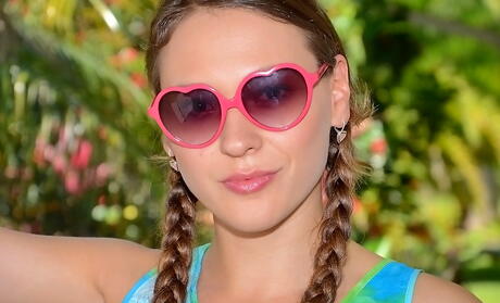 Gracile american teen Callie Calypso in glasses exhibits her butt and spreads her legs