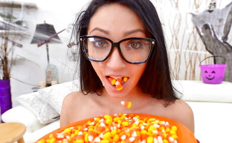 Gracile american young Cyrstal Rae work with wet lips on huge dick and enjoys a cum shot on face