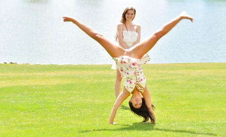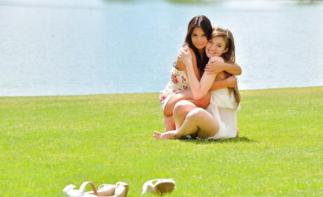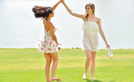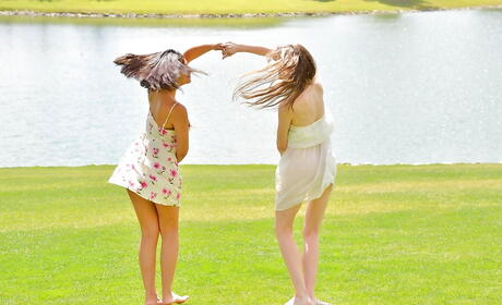 Gracile beauties Violet Starr and Eva Celeste enjoy some playful lesbian foreplay outdoor