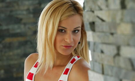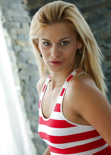 Gracile blond youthful Kelly White in fancy shorts unveils tiny tits and pussy