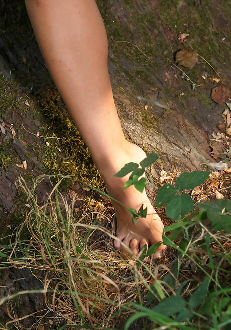 Gracile blonde babe Cristina A shows small tits and hairy twat outside
