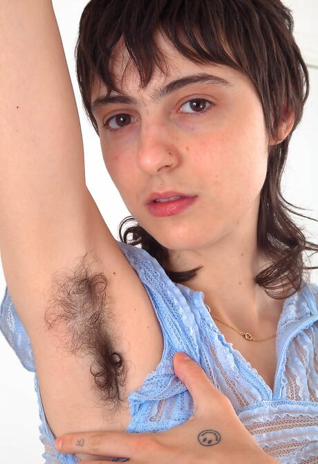 Gracile dark-haired babe Frida in hot panties reveals tiny tits and hairy pussy