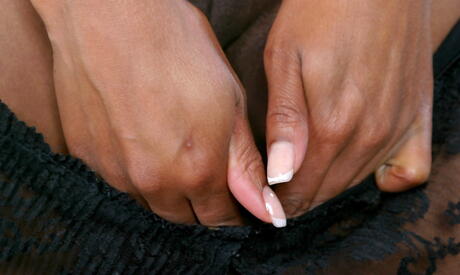 Gracile dark-haired young Karis denudes big boobs and spreads her legs