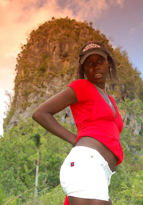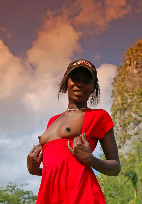 Gracile hottie Maria L uncovering small tits and sexy ass outside