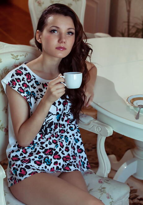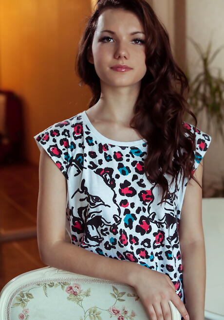 Gracile young Iva in shorts reveals small tits and hairy pussy