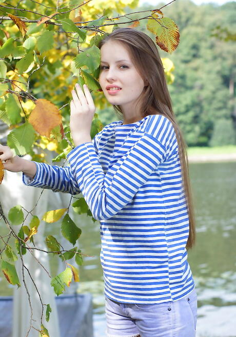 Gracile youthful Victoriya A bares small tits and hairy beaver outdoor