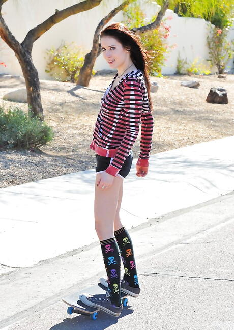 Hot american babe Aiden Ashley in fancy shorts exhibiting her butt outdoor