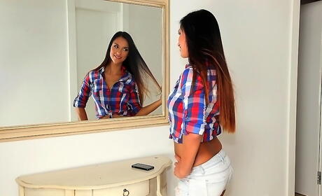 Hot american babe Victoria Sweet in sexy shorts revealing her ass and spreading her legs