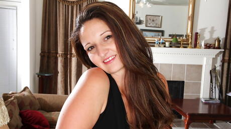 Hot american brunette older Tiffany Owens unveils small tits and puts a toy in her twat