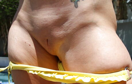 Hot american Dee Siren in bikini reveals her ass and shaved pussy near the pool