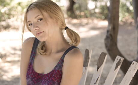 Hot blond teen Lena Anderson in shorts exposing tiny tits and nice pussy outdoor