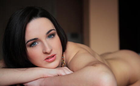 Hot brunette teen Karen A exposing small tits and bald pussy