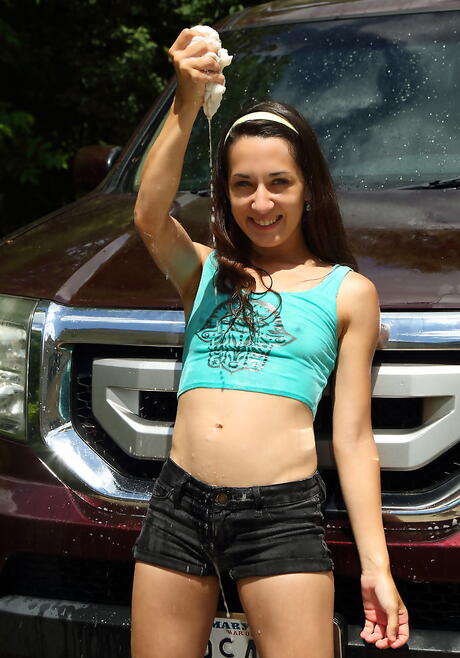 Hot brunette youthful Freya Von Doom reveals tiny tits and toys her cunt outdoor