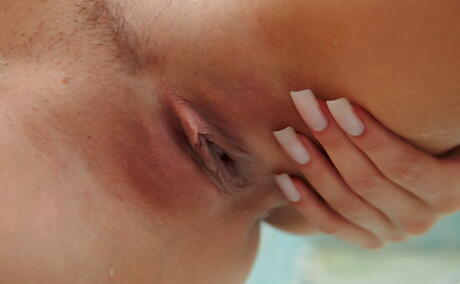 Hot brunette youthful Stasia baring big hooters and spreading her legs near the pool