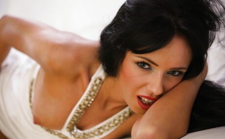 Hot czech dark-haired Gina Devine posing in fancy skirt on camera