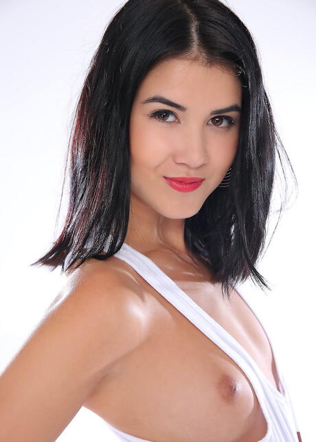 Hot czech dark-haired teen Lady Dee in sexy shorts baring small tits and spreading her legs
