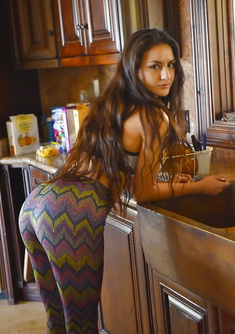 Hot dark-haired babe Natalie baring small tits and playing with toy in kitchen