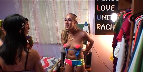 Hot girls Cadence Lux, Zoe Parker and Marina Angel have a passionate lesbian foreplay in coed party