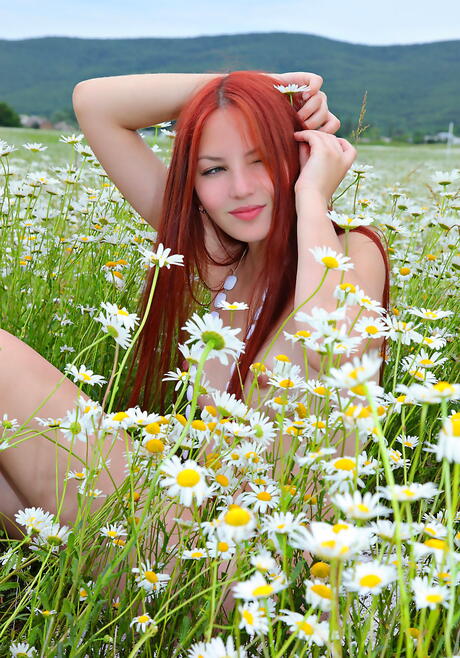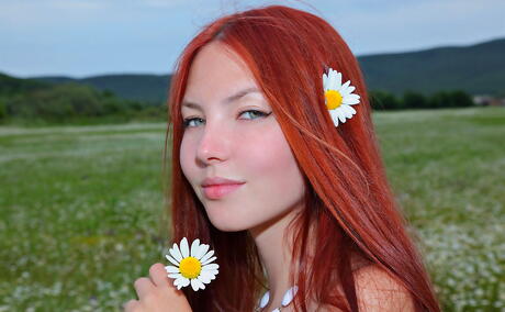 Hot red-haired young Nalli A in undies shows tiny tits and ass outdoor